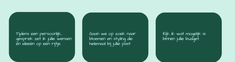 IK regel zowel de bloemen als de styling. Super handig om dit allebei door mij te laten doen. Zo weet je zeker dat echt alles mooi op elkaar aansluit!