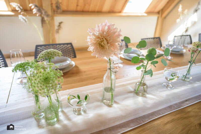 Een super locatie in de polder. Een bloemstyling met riet en bloemen van het seizoen in zachte pastelkleuren